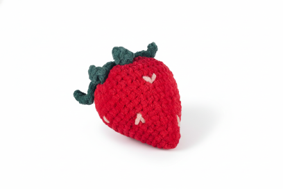 Ręcznie szydełkowana truskawka z pluszowej włóczki, z antyalergicznym wypełnieniem silikonowym. Materiały z OEKO-TEX® Standard 100.