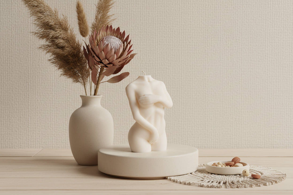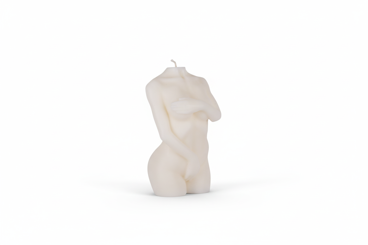 Świeca sojowa w kształcie subtelnie zakrytej kobiecej sylwetki emanuje elegancją i delikatną siłą.